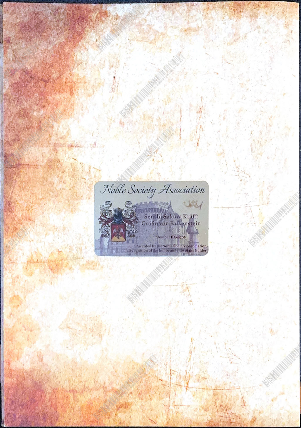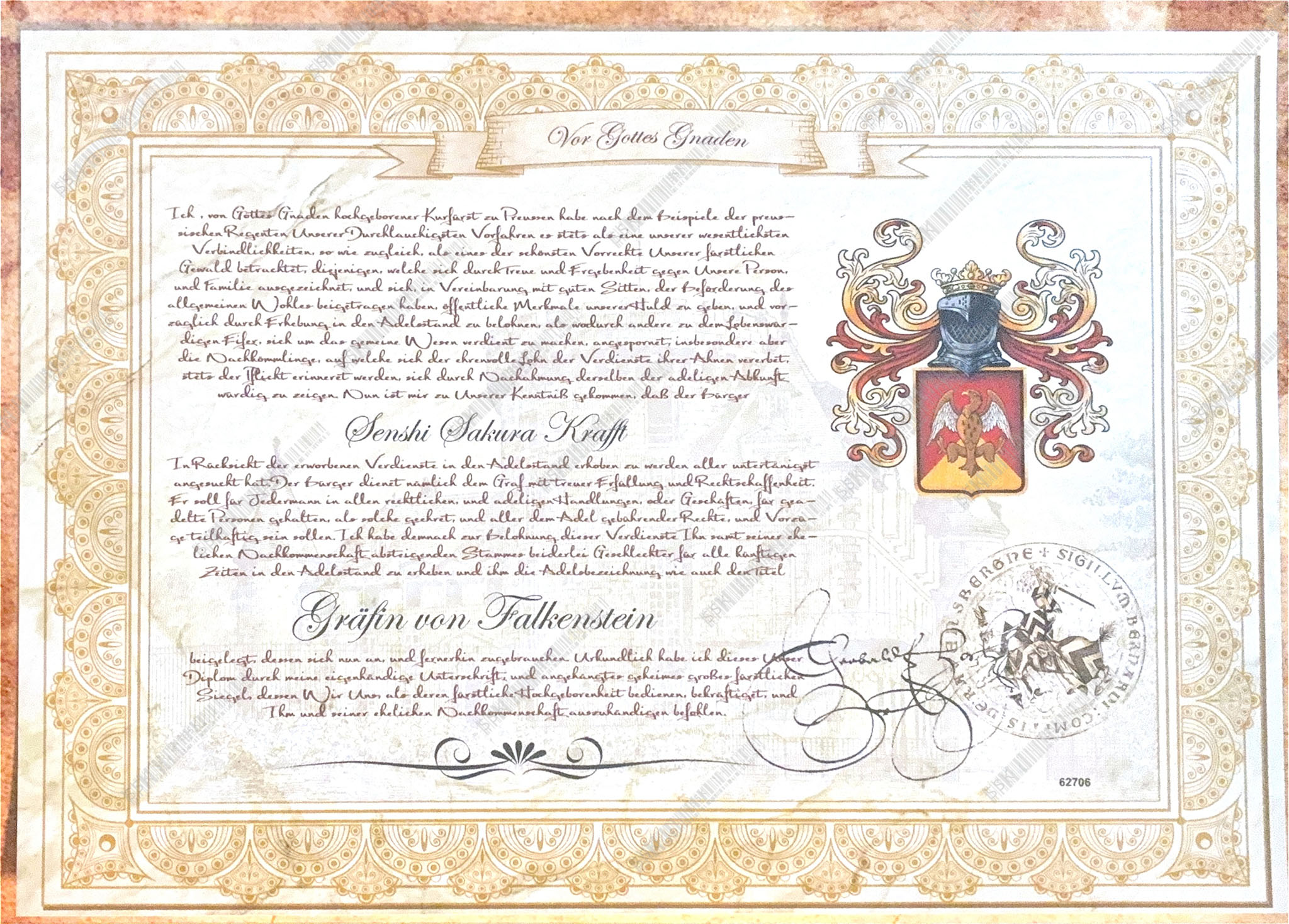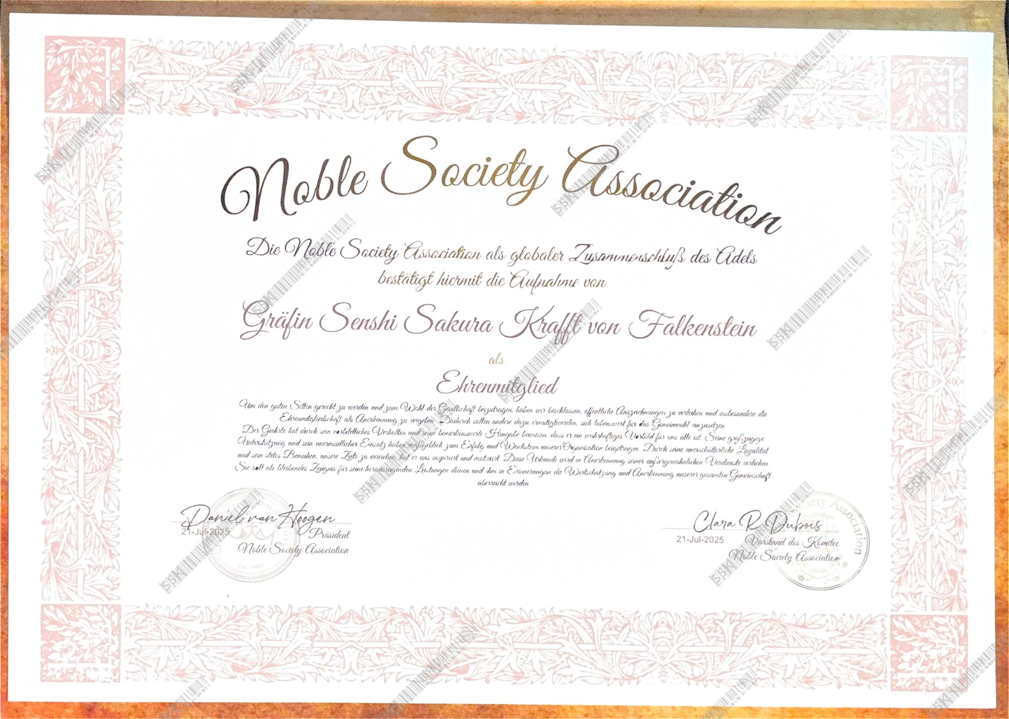 Deckblatt – vergrößert öffnen Deckblatt - Certificat Beurkundung – vergrößert öffnen Beurkundung - Noble Society Ehrenurkunde – vergrößert öffnen Ehrenurkunde - Gräfin Mitgliedskarte – vergrößert öffnen Rückseite mit Mitgliedskarte